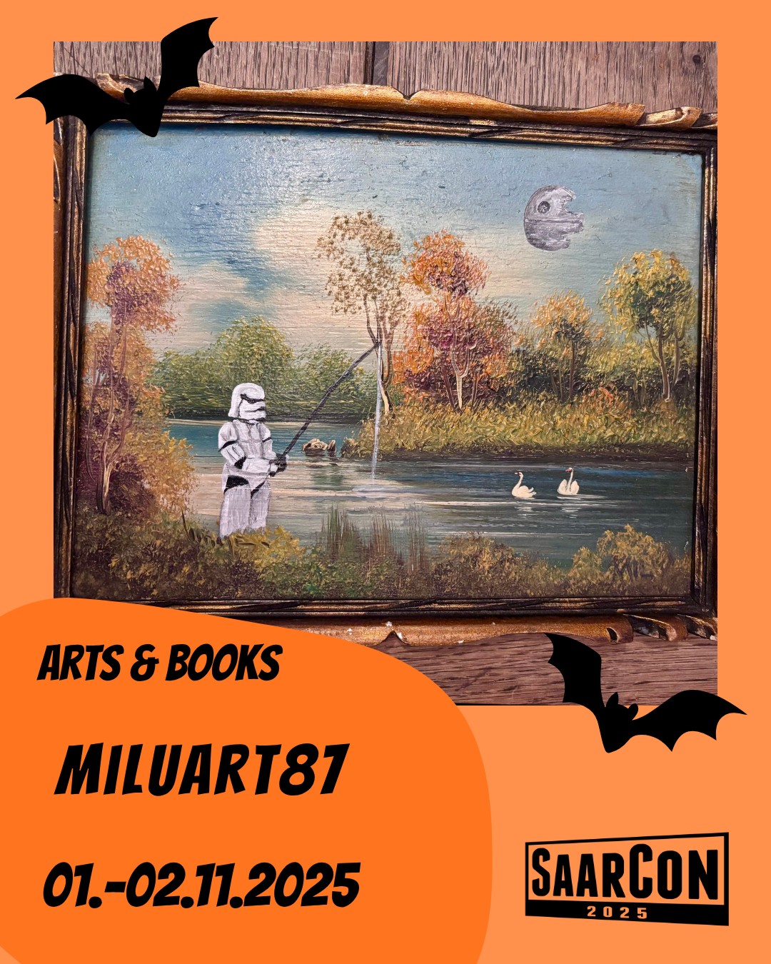 @miluart87 könnt ihr dieses Jahr in unserem Arts & Books Bereich antreffen!Wenn Oma wüsste, dass Darth Vader jetzt in ihrem alten Gemälde wohnt…Ich mache aus alten Bildern neue Kunstwerke, jedes ein echtes Unikat.Meine Arbeiten findet ihr bei Instagram unter miluart87!#saarcon #saarcon2025 #saarland #saarbruecken #uds #unisaarland #artistalley #miluart87 #gemälde #nerdkunst