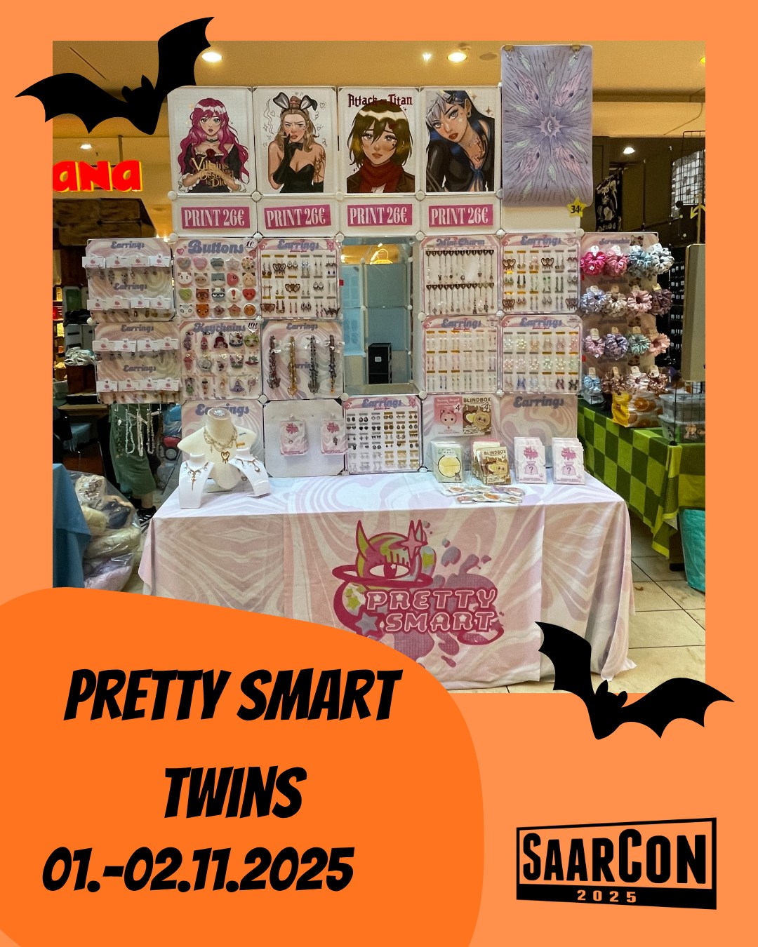 Hey! Wir sind Ella und Lina von @pr@prettysmarttwins Wir gestalten Edelstahl Ohrringe mit Natursteinen und kreativen Designs, nähen Scrunchies mit eigenen Motiven und stecken in jedes Produkt ganz viel Liebe.Wenn du Lust auf kreative Stücke mit besonders guter Qualität hast, dann besuch uns doch an unserem Stand!! 🫰Kunstdrucke (selbst entworfene Artprints)Ansteckbuttons (selbst gepresst und designed)Aufkleber (eigene Designs)Handgemachter Schmuck: Ohrringe nach eigenem Design (Edelstahl oder Enamel-Anhänger alle Anhänger sind von mir Designs und nur bei mir erhältlich kein AliExpress ! )Schmuckanhänger (handgefertigt)Acrylschlüsselanhänger (eigene Designs)Handgefertigte Scrunchies mit eigenen StoffenTaschen: Selbst genäht oder bestickt, Mit eigenen entworfenen Motiven mittels Siebdruck versehen oder Digitaldruck#saarcon #saarcon2025 #saarland #saarbruecken #uds #unisaarland #artistalley #artsandbooks #schmuck #supportartists #localartists
